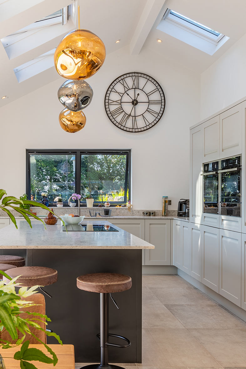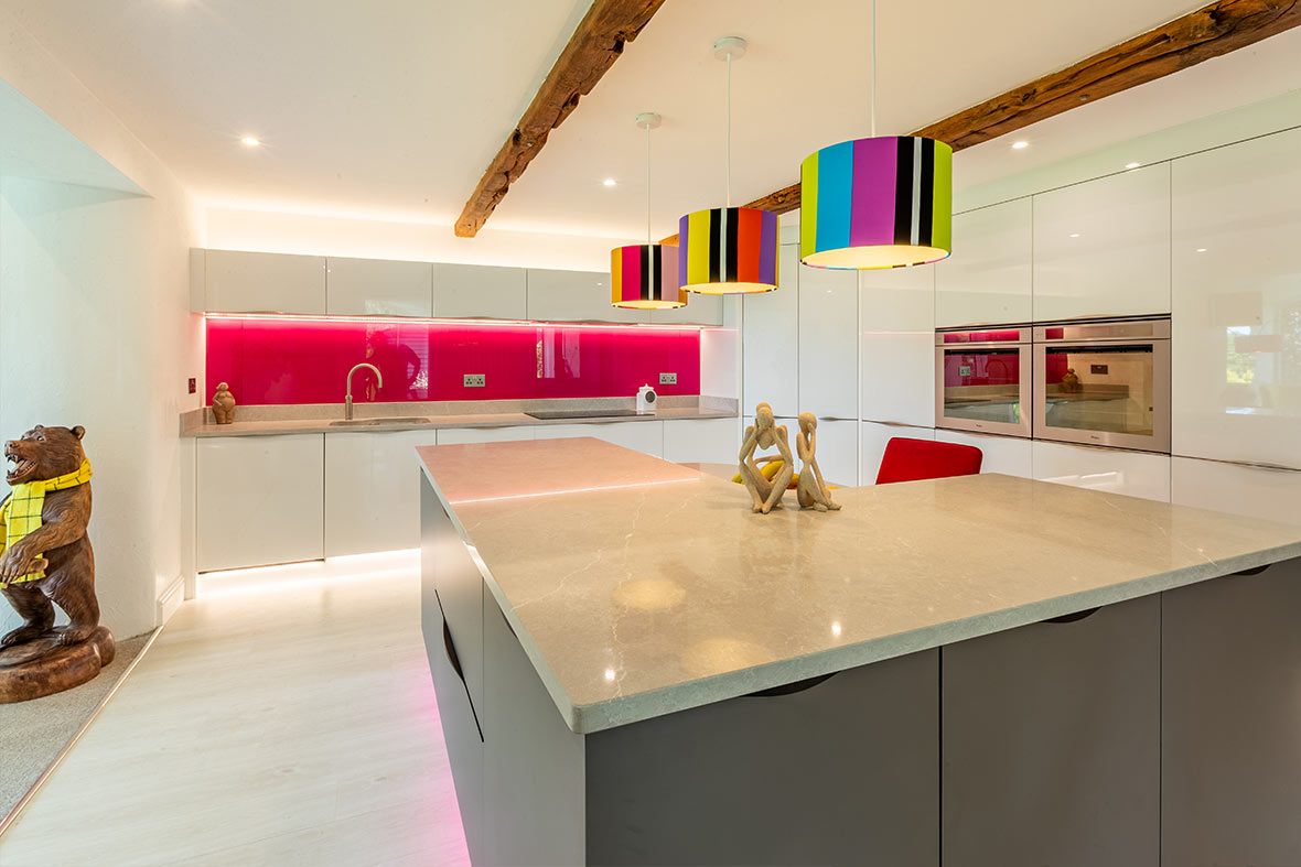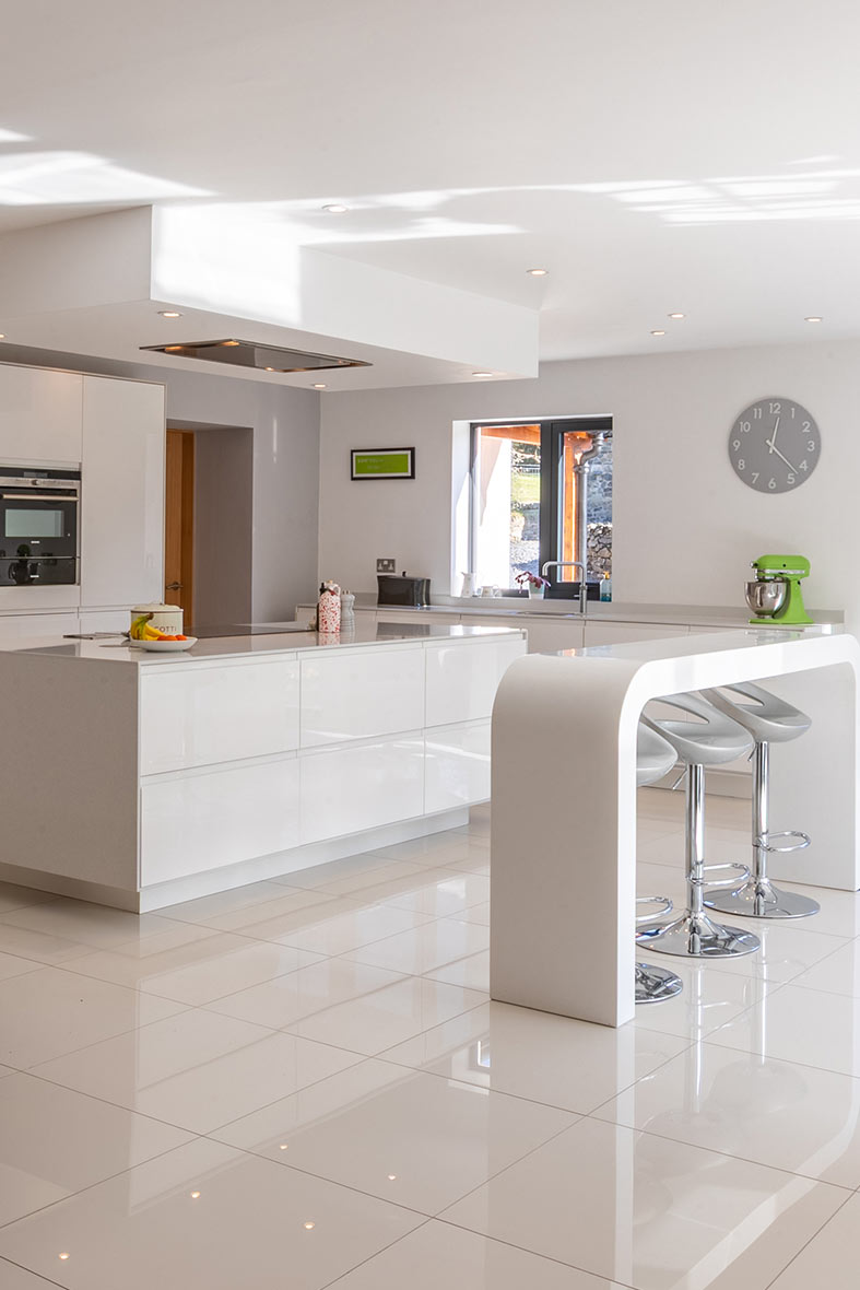Start with a clean, flat door style in a gloss or matt finish, depending on the feel you want. Keep the colour palette tonal and restrained, adding depth with contrast in worktops or splashbacks. Integrated appliances and uninterrupted worktops maintain the crisp lines.