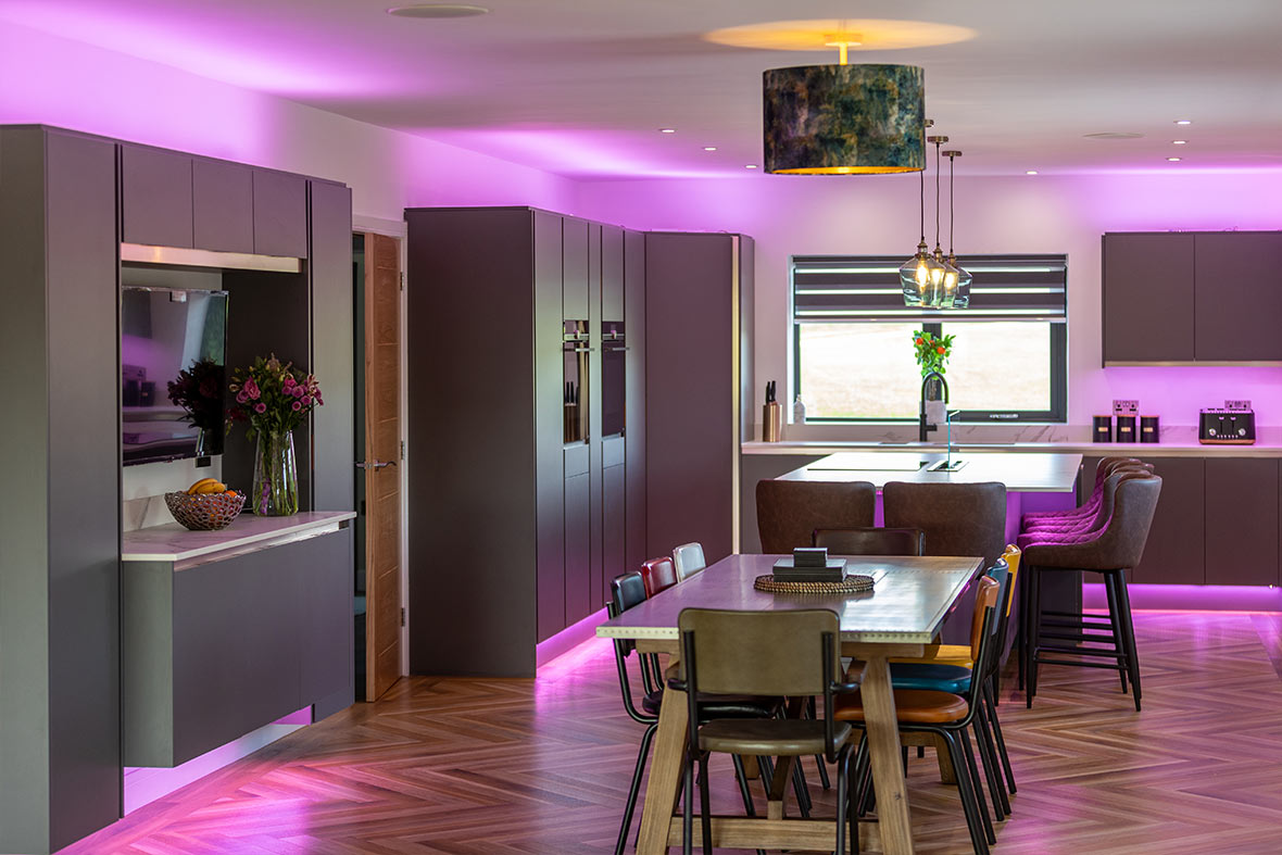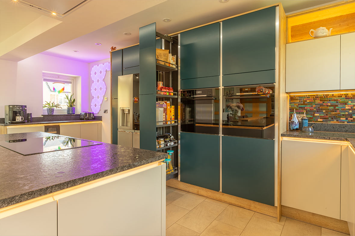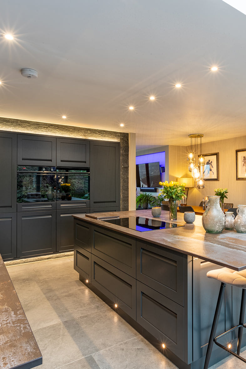 Lighting plays a key role in shaping this look. Plinth, under-cabinet or internal lighting all help highlight the materials and create a soft, even glow.